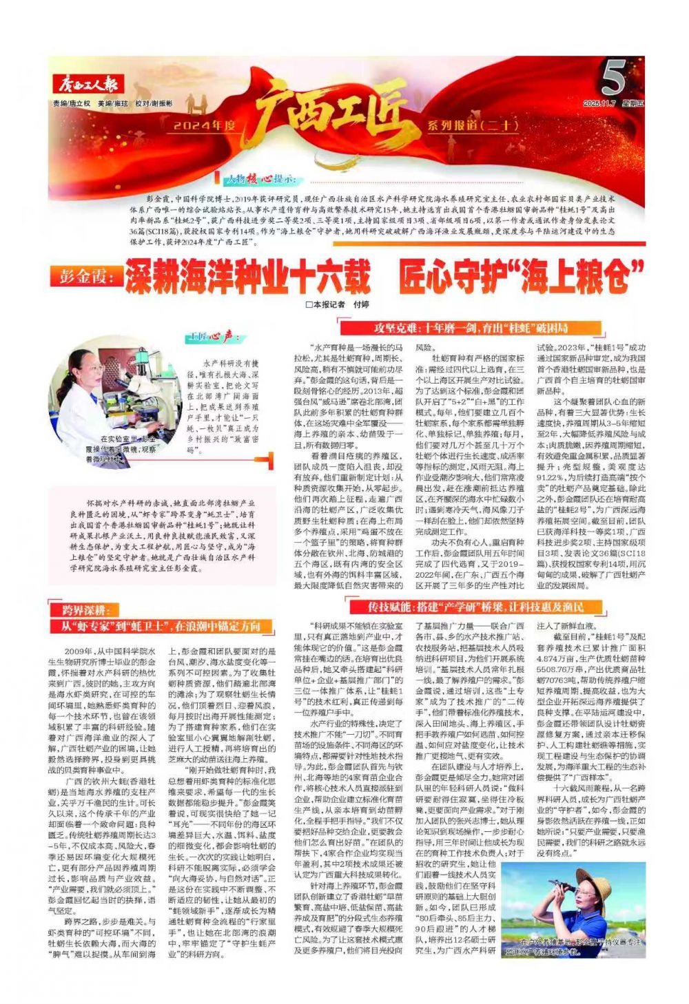 人物核心提示:彭金霞,中国科学院博士,2019年获评研究员,现任广西壮族自治区水产科学研究院海水养殖研究室主任,农业农村部国家贝类产业技术体系广西唯一的综合试验站站长。从事水产遗传育种与高效繁养技术研究15年,她主持选育出我国首个香港牡蛎国审新品种“桂蚝1号”及高出肉率新品系“桂蚝2号”,获广西科技进步奖二等奖2项、三等奖1项,主持国家级项目3项、省部级项目6项,以第一作者或通讯作者身份发表论文36篇(SCI18篇),获授权国家专利14项。作为“海上粮仓”守护者,她用科研突破破解广西海洋渔业发展瓶颈,更深度参与平陆运河建设中的生态保护工作,获评2024年度“广西工匠”。